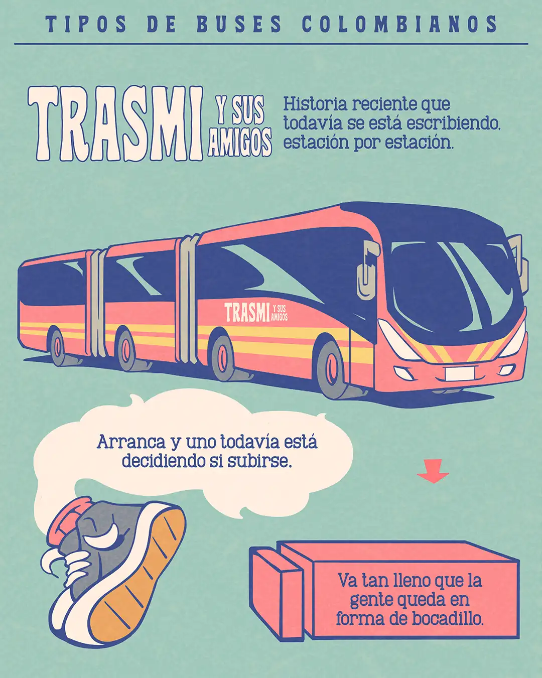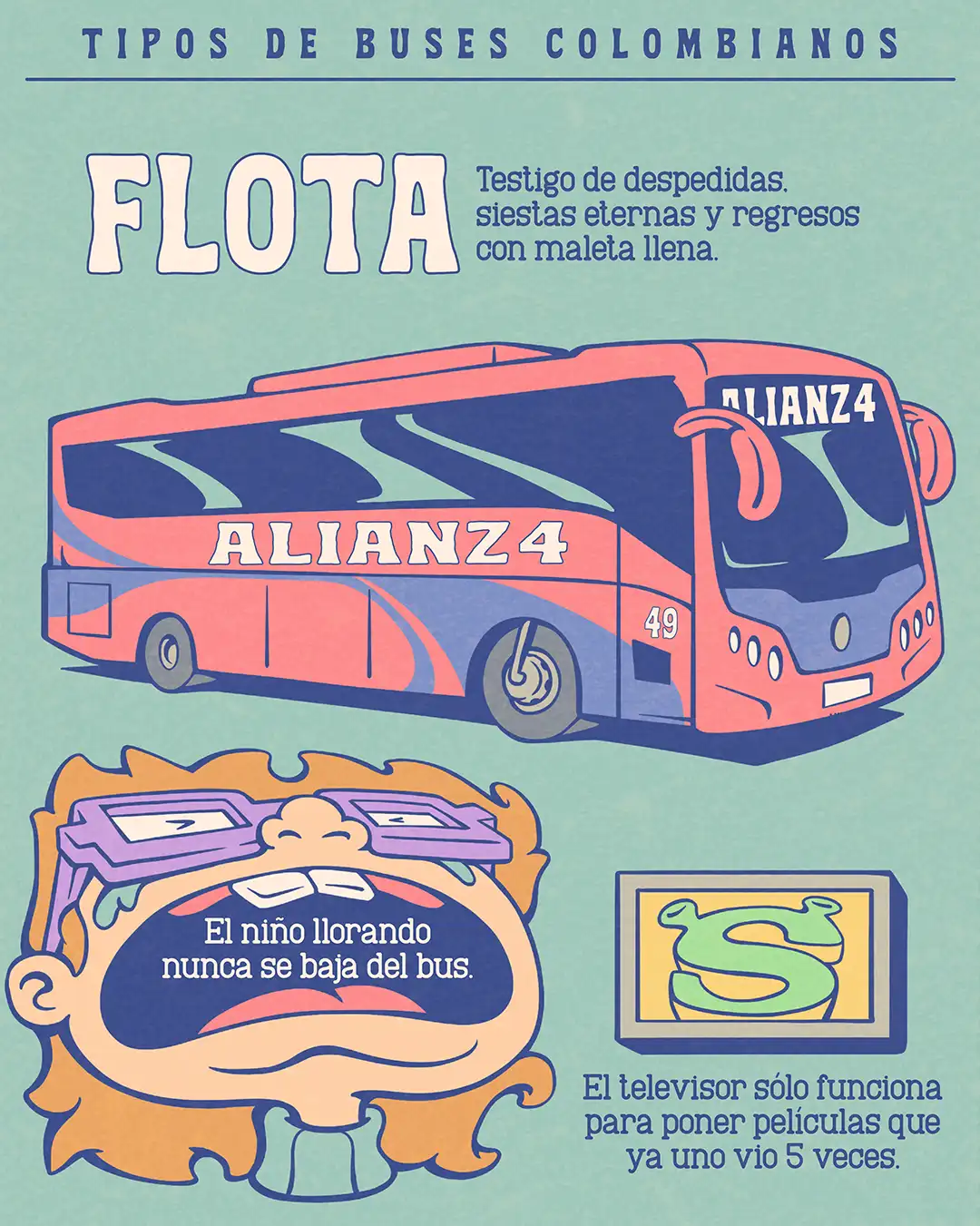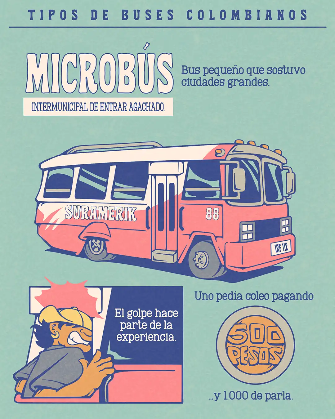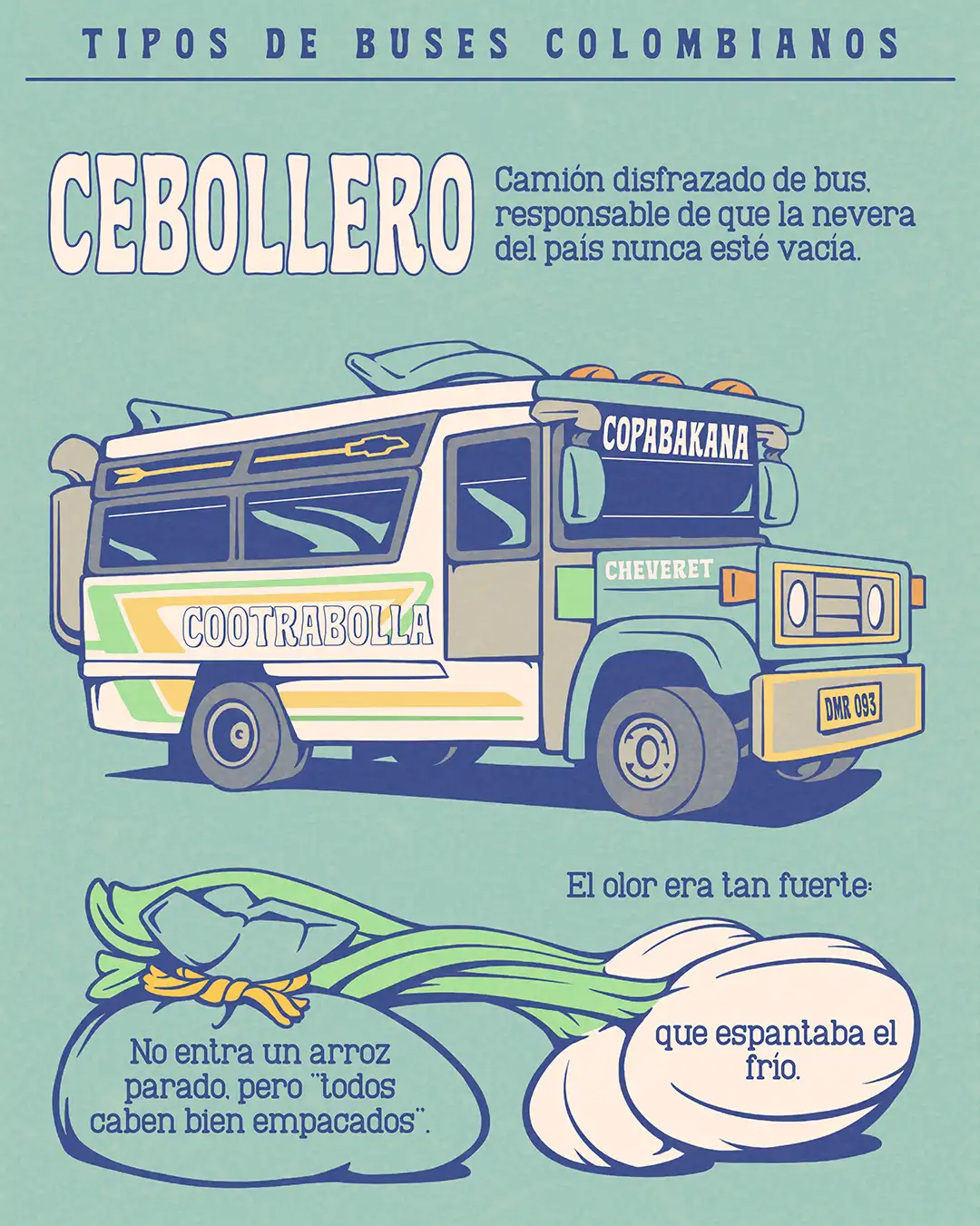 Desde la niebla en la montaña hasta el smog entre el tráfico capitalino, chivas y buses nos han transportado entre abarrotes, camándulas y splash de pera. Como ocurre con los enemil tipos de arepas en el país, hay una diversidad tan vasta de estas máquinas con ruedas que simplemente no las podíamos ignorar. Invitamos entonces a Pua para que ilustrara la anatomía de estos vehículos profundamente autóctonos. Pare y siga por esta vía ilustrada.