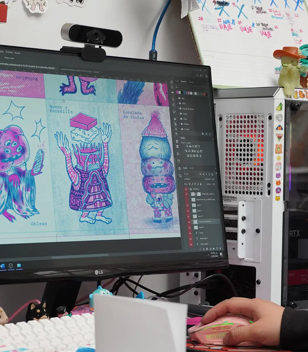 Aprenderás a crear tu primer fanzine tipo “ruana”, un pequeño libro con portada y contraportada que guarda una historia, con la sorpresa de que cuando lo despliegues también podrás tener tu propio cartel. En el proceso conocerás todo lo que ocurre antes de imprimir: desde elegir la temática y digitalizar tus bocetos hasta crear el formato correcto en Illustrator, separar los colores por capas y aplicar modos de mezcla para simular el resultado final. Luego verás cómo preparar el archivo en escala de grises, cómo se intercambian los tambores de color en la máquina Riso, y cómo cada papel reacciona distinto a las tintas dependiendo de su tonalidad. Al final, solo queda cortar, doblar y ensamblar tu publicación. Un fanzine con historia, textura y la magia imperfecta de la risografía.