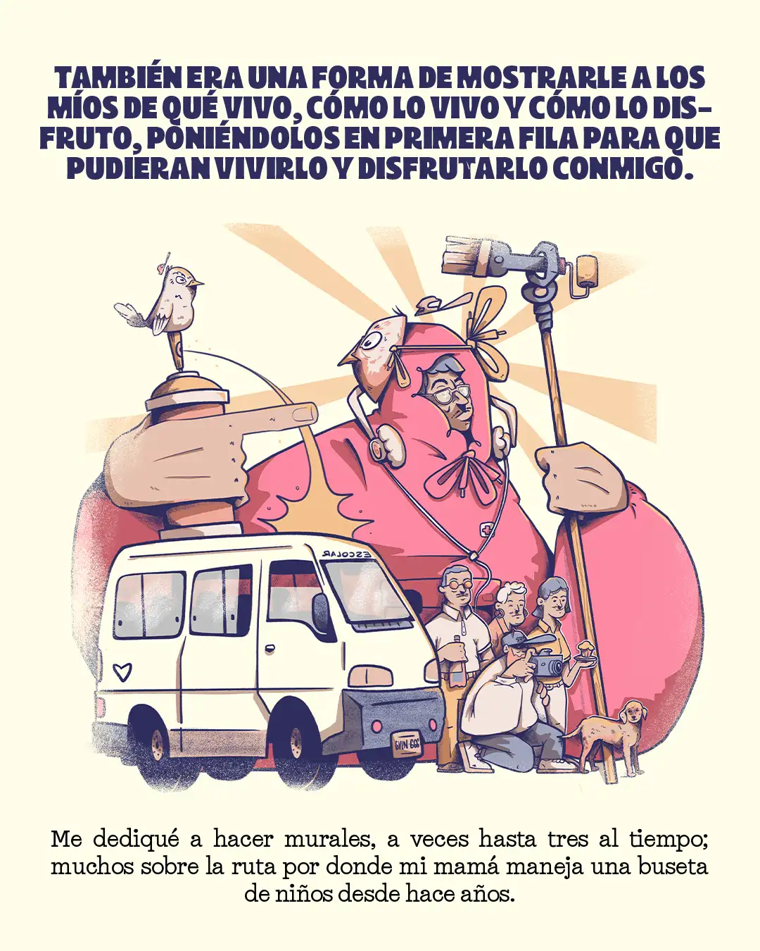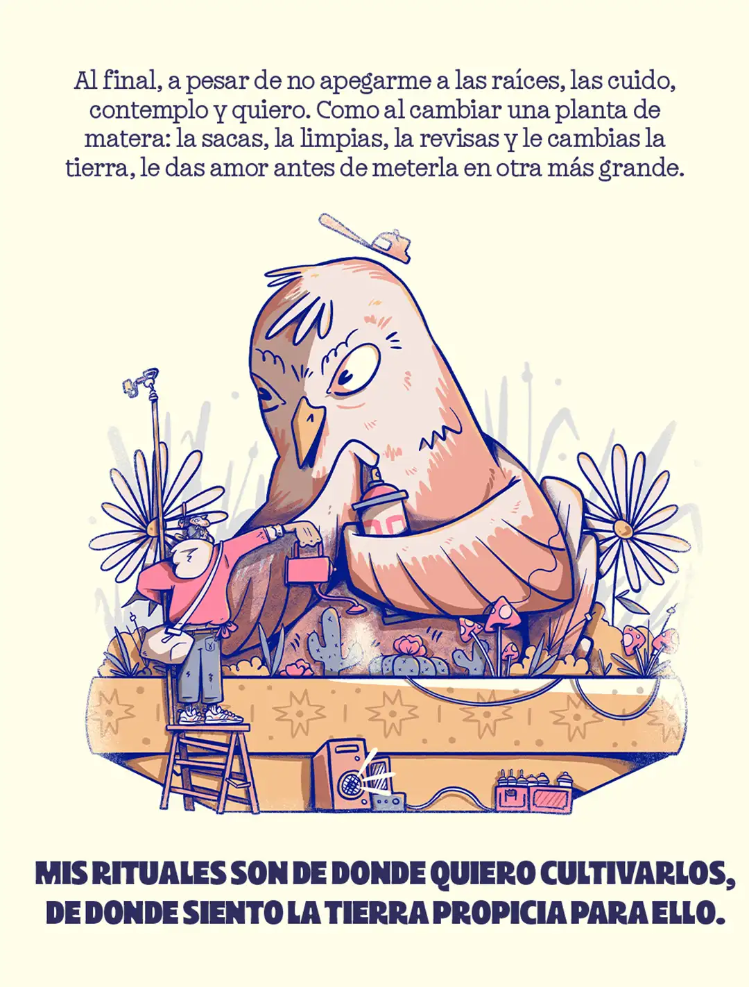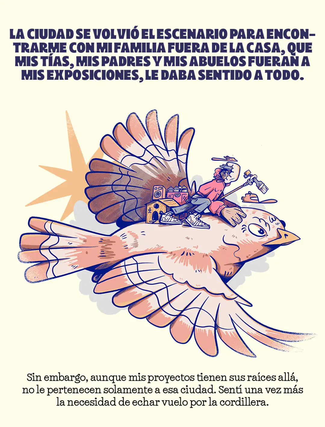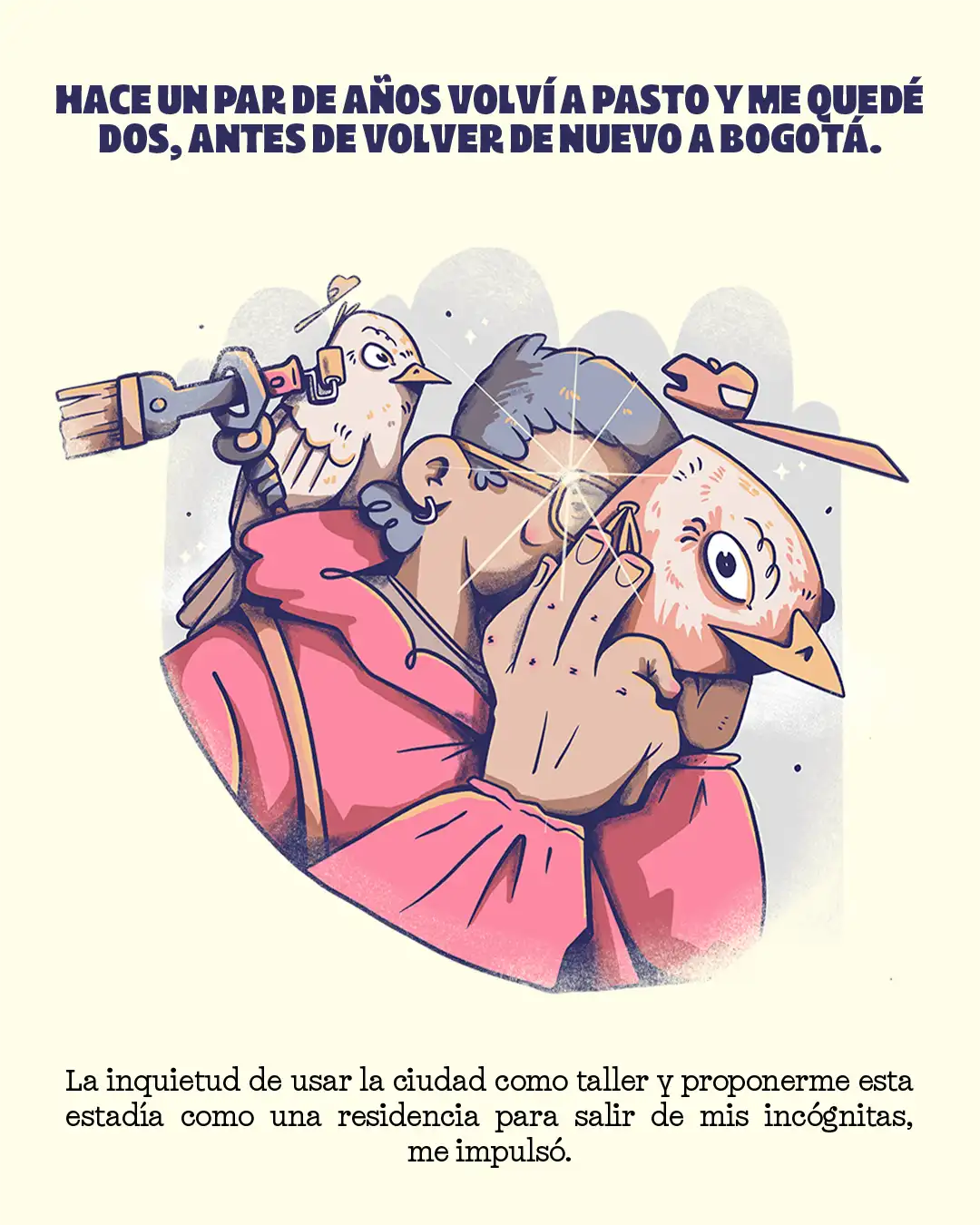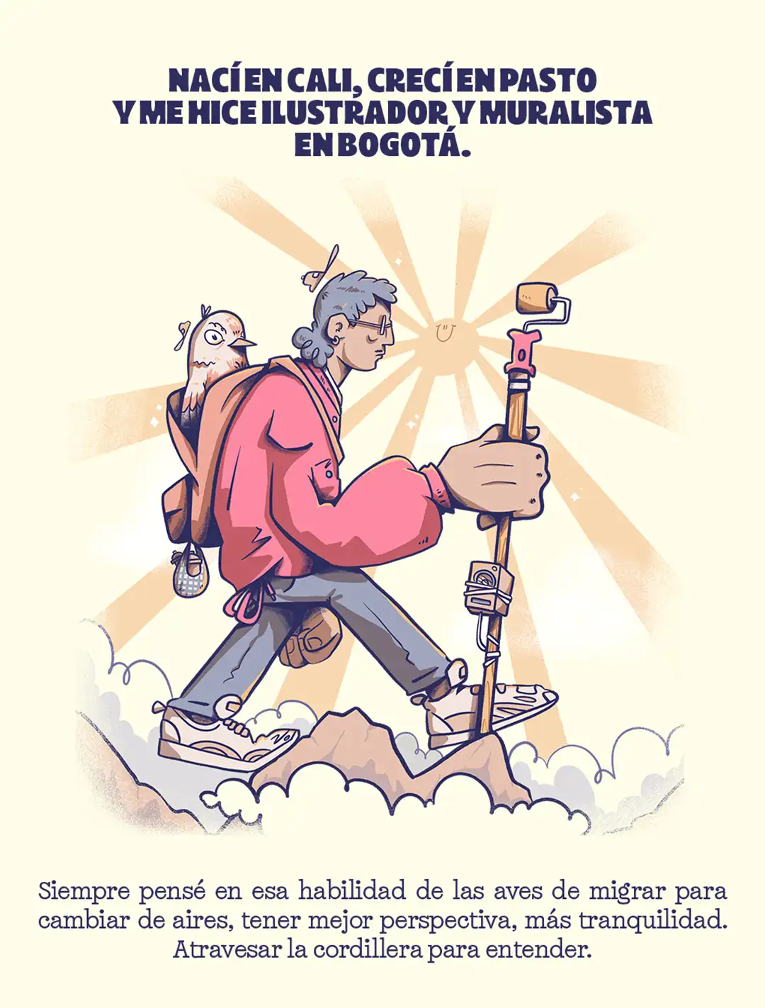 ¿Cómo es volver a la ciudad natal cuando se ha hecho camino lejos? ¿Qué se busca creativamente cuando se regresa y nos volvemos a ir? ¿Qué significa entonces el arraigo? Luego de dos años de vuelta a Pasto, Gavilán vuelve no sólo a Bogotá, sino a esta revista a contarnos su historia de ires y venires entre muros, pinturas y afectos sobrevolando esta cordillera en la que poco a poco ha ido moviendo sus ideas y su nido.