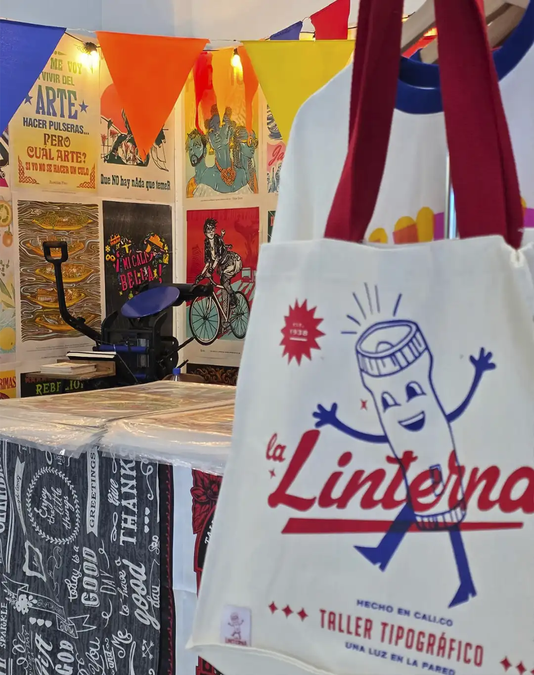 A eso se suma un relevo generacional activo: ayudantes que aprenden directamente de los maestros, hijos y nietos que se forman en el grabado y el manejo de las máquinas, y jóvenes diseñadores que traducen nuevas estéticas al lenguaje técnico del taller. Ese conocimiento no se enseña en universidades. Se transmite en el hacer, en la repetición paciente, en el error. Por eso, La Linterna funciona también como hogar, taller y escuela informal: un espacio donde artistas y diseñadores aprenden a pensar desde la imprenta, entendiendo las limitaciones y posibilidades de máquinas que datan de finales del siglo XIX.