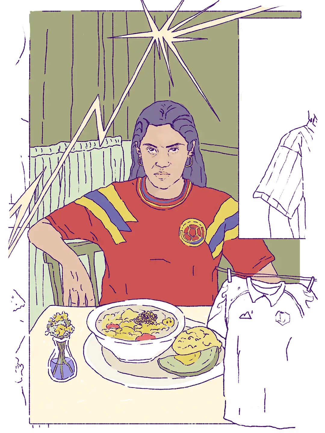 La camiseta de Colombia de Enrique fue usada por Bernardo Redin, quien anotó dos goles en ese Mundial. Redin la cambió con el alemán Jürgen Kohler, quien después la vendió a la tienda en donde Enrique la compró al dejar de pagar un semestre de la maestría que cursaba entonces. Cuando Enrique saca la camiseta de la bolsa me sorprende lo bien que está conservada: ni una hebra, ni una mancha, ni un desteñido, al contrario, la tela es gruesa y transpirable y el rojo vibra de maneras distintas según le pegue la luz.