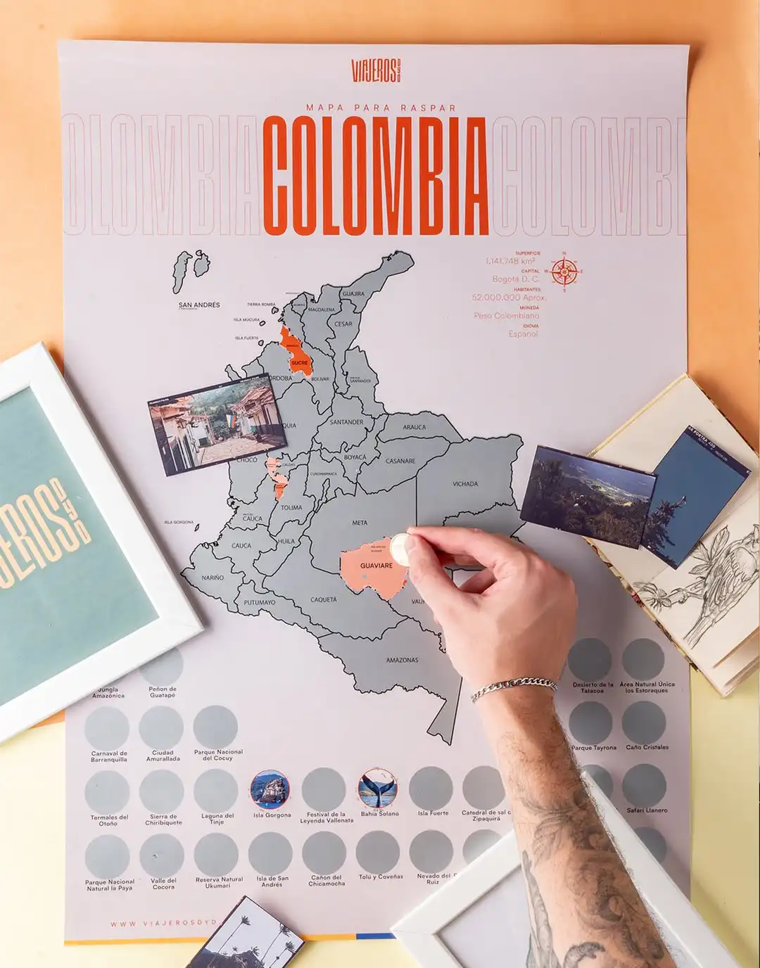 Para esto, dos viajeros colombianos, Daniel Orozco y David Gómez convirtieron la manía de viajar y recorrer el mundo en “trofeos viajeros”: mapas, afiches del mundo o de los departamentos de Colombia para rascar como un bingo y presumir como un logro en las paredes de su casa.
